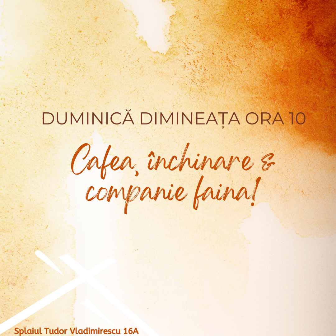 Ești binevenit în fiecare duminică de la ora 10! Vino pentru un timp de închinare având ca fundal muzică creștină contemporană, ascultă un mesaj despre Dumnezeu și neapărat rămâi la o cafea după, pentru un timp de părtășie cu noi.