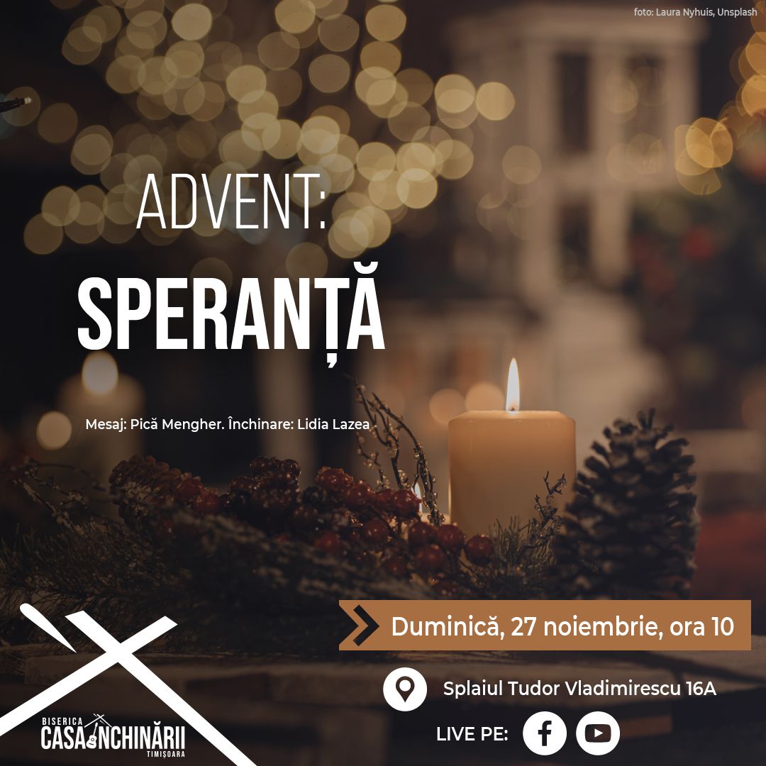 Ești binevenit în fiecare duminică de la ora 10! Vino pentru un timp de închinare având ca fundal muzică creștină contemporană, ascultă un mesaj despre Dumnezeu și neapărat rămâi la o cafea după, pentru un timp de părtășie cu noi.