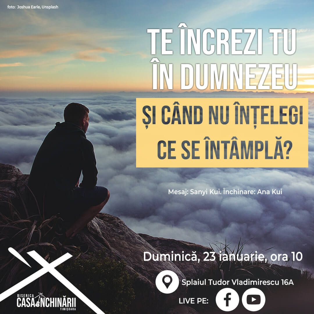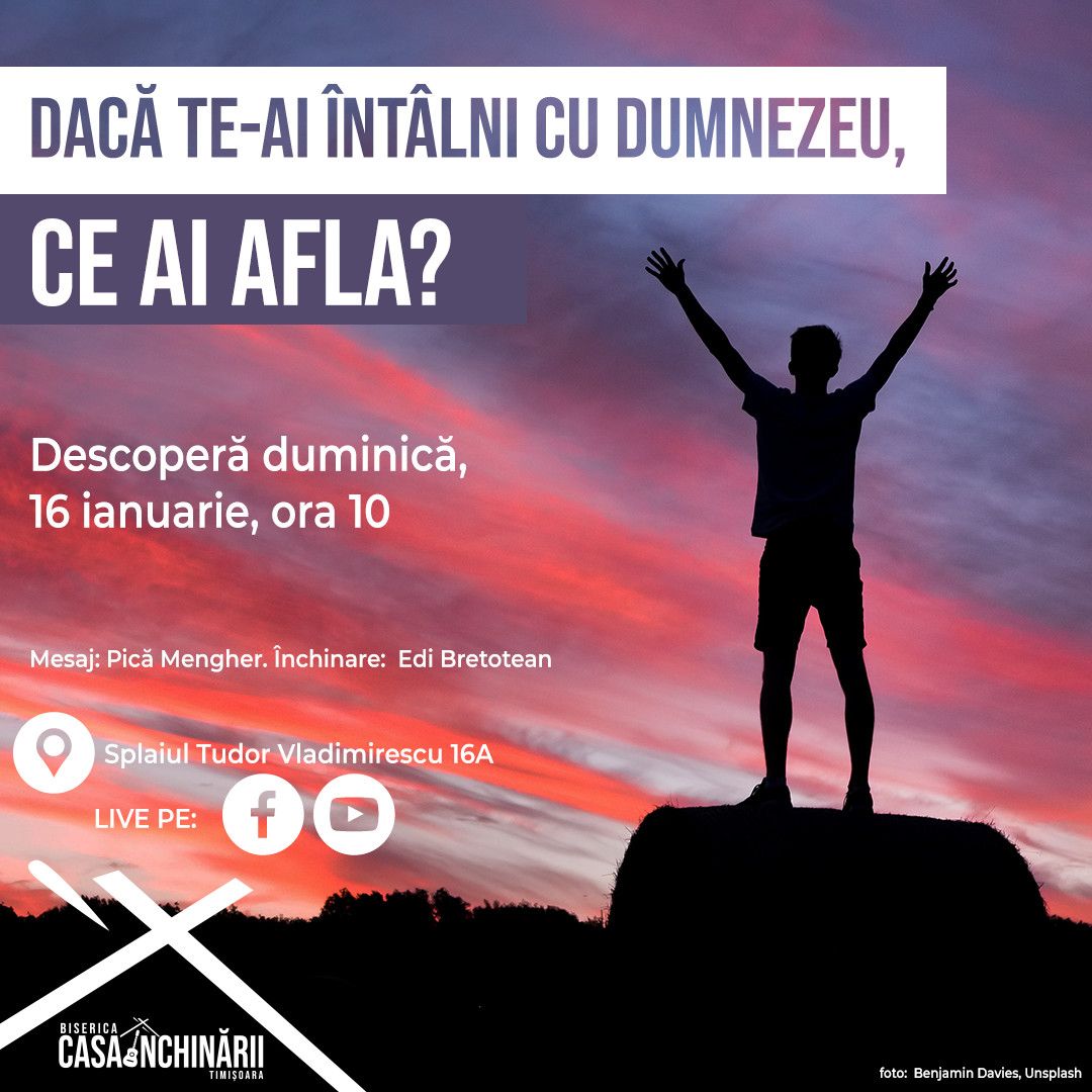 Ești binevenit în fiecare duminică de la ora 10! Vino pentru un timp de închinare având ca fundal muzică creștină contemporană, ascultă un mesaj despre Dumnezeu și neapărat rămâi la o cafea după, pentru un timp de părtășie cu noi.