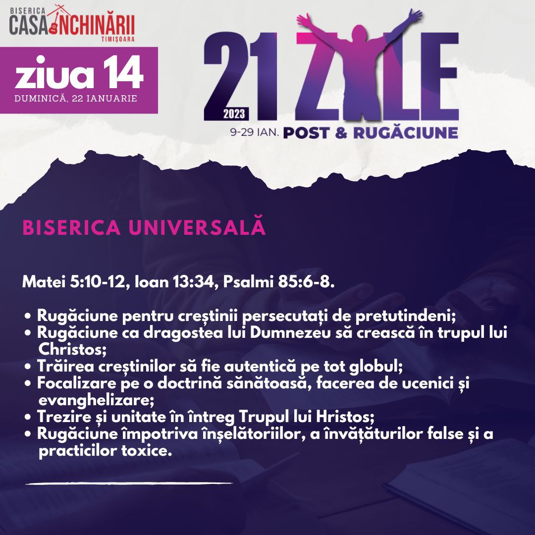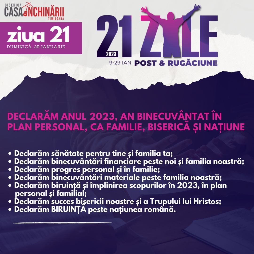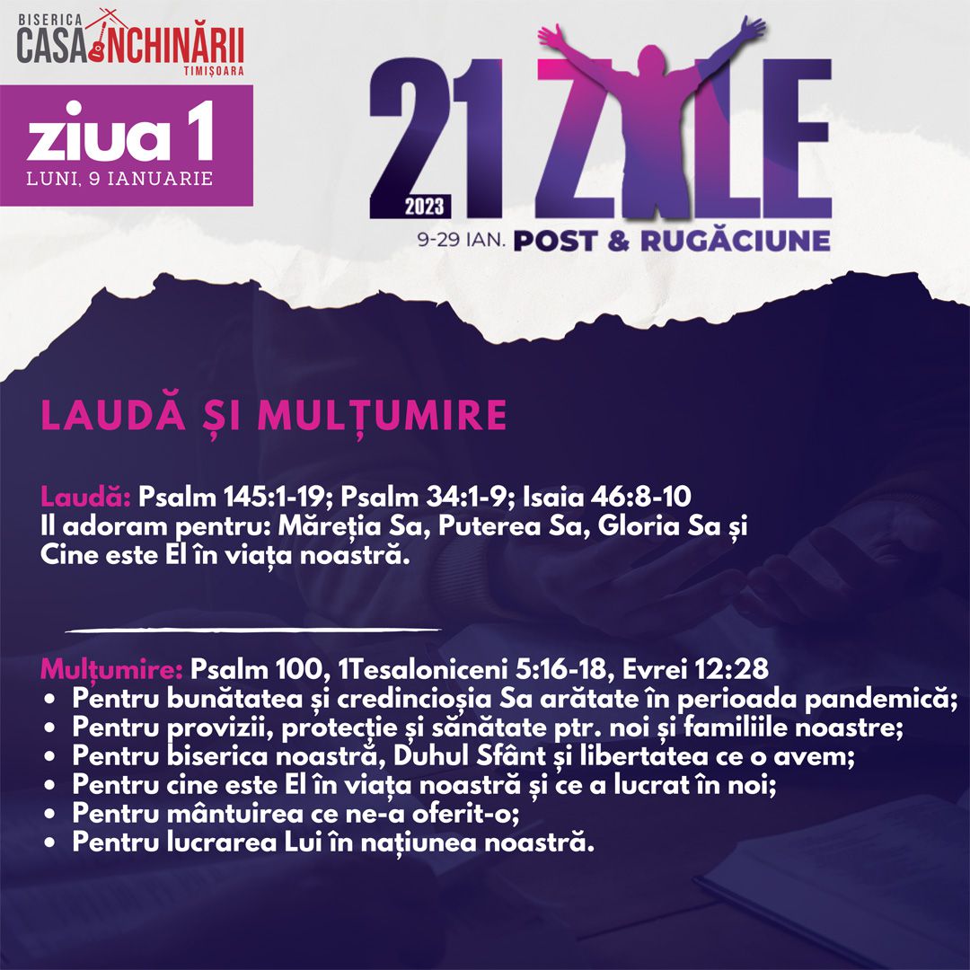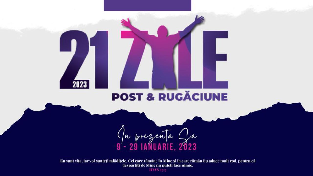 Să ne unim cu toții într-o perioadă de 21 zile de Post și Rugăciune, între 9-29 Ianuarie, apropiindu-ne de Domnul mai mult, pentru a putea împlini scopurile pe care El le are pentru noi în noul an 2023. Vom avea teme de rugăciune zilnice, postate online mai jos și disponibile și în format tipărit.
