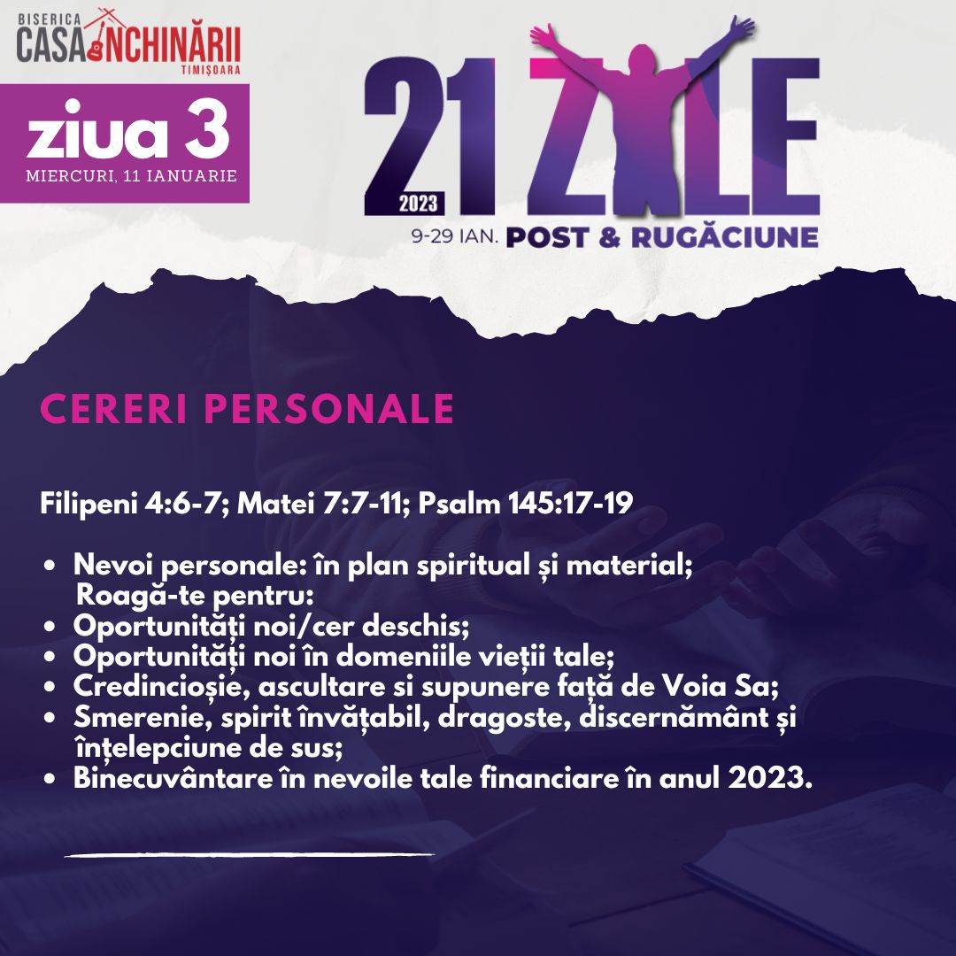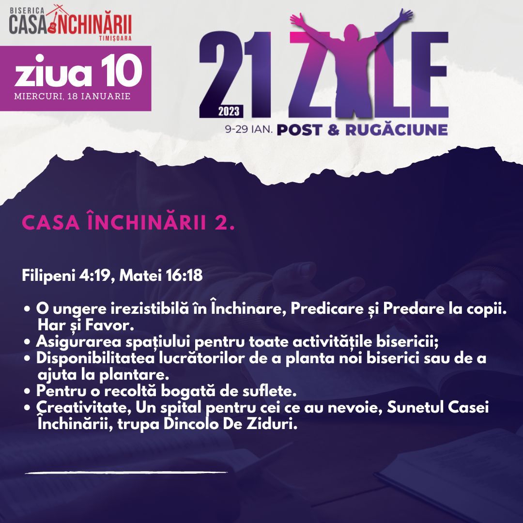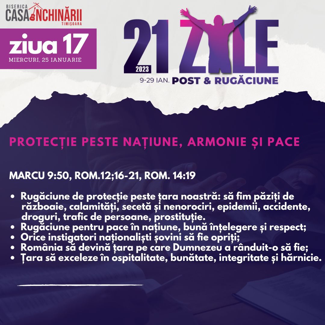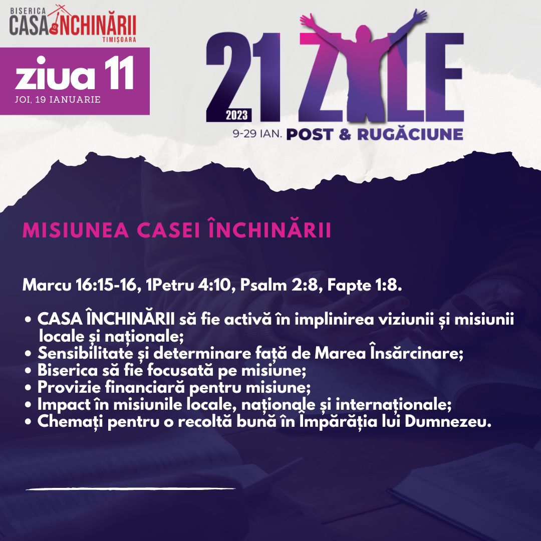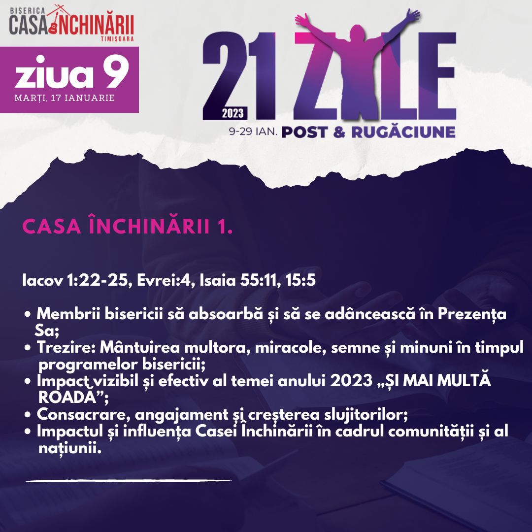 Să ne unim cu toții într-o perioadă de 21 zile de Post și Rugăciune, între 9-29 Ianuarie, apropiindu-ne de Domnul mai mult, pentru a putea împlini scopurile pe care El le are pentru noi în noul an 2023. Vom avea teme de rugăciune zilnice, postate online mai jos și disponibile și în format tipărit.