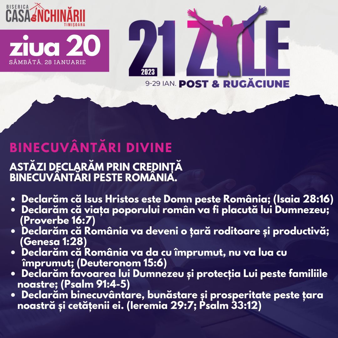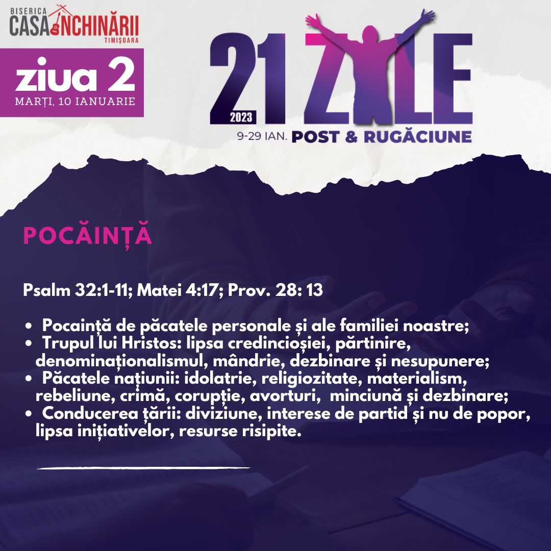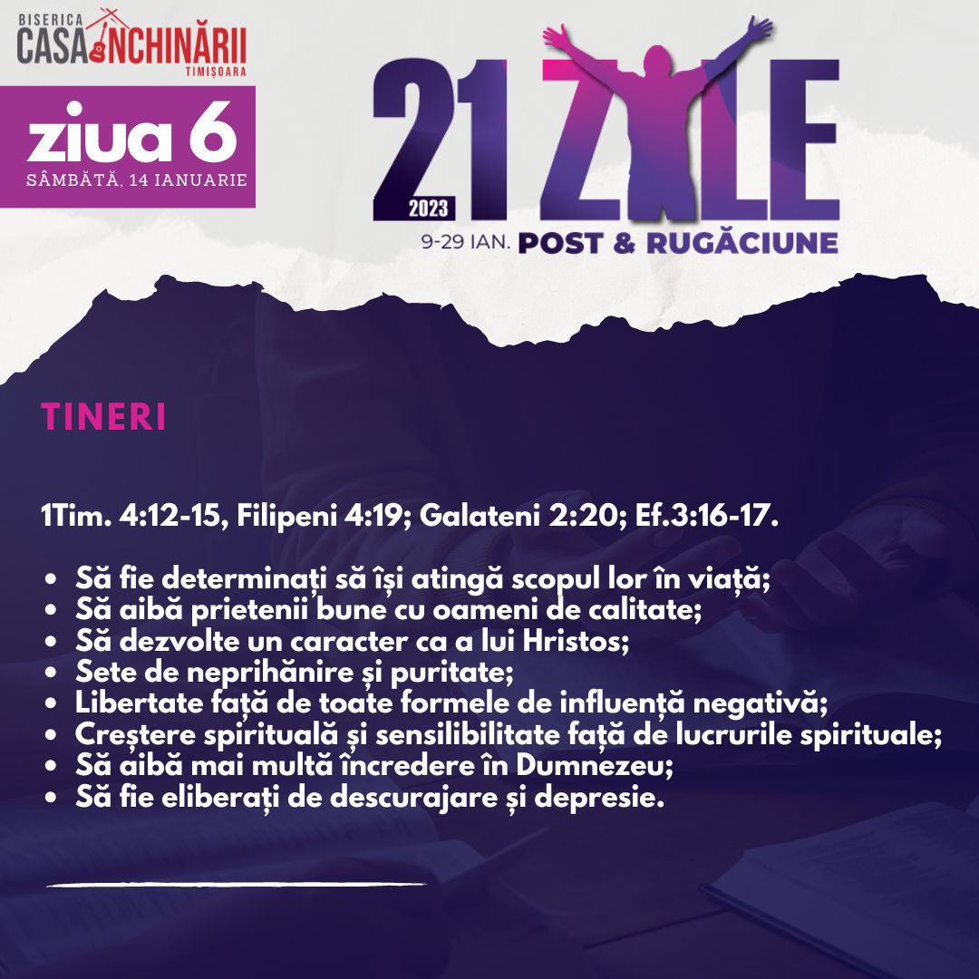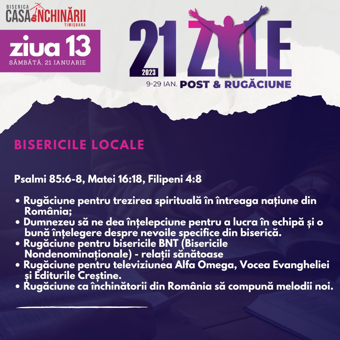 Să ne unim cu toții într-o perioadă de 21 zile de Post și Rugăciune, între 9-29 Ianuarie, apropiindu-ne de Domnul mai mult, pentru a putea împlini scopurile pe care El le are pentru noi în noul an 2023. Vom avea teme de rugăciune zilnice, postate online mai jos și disponibile și în format tipărit.