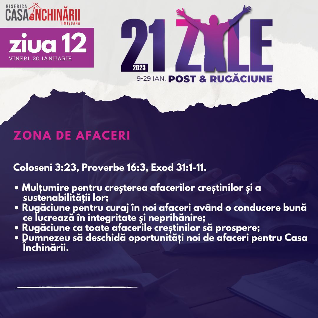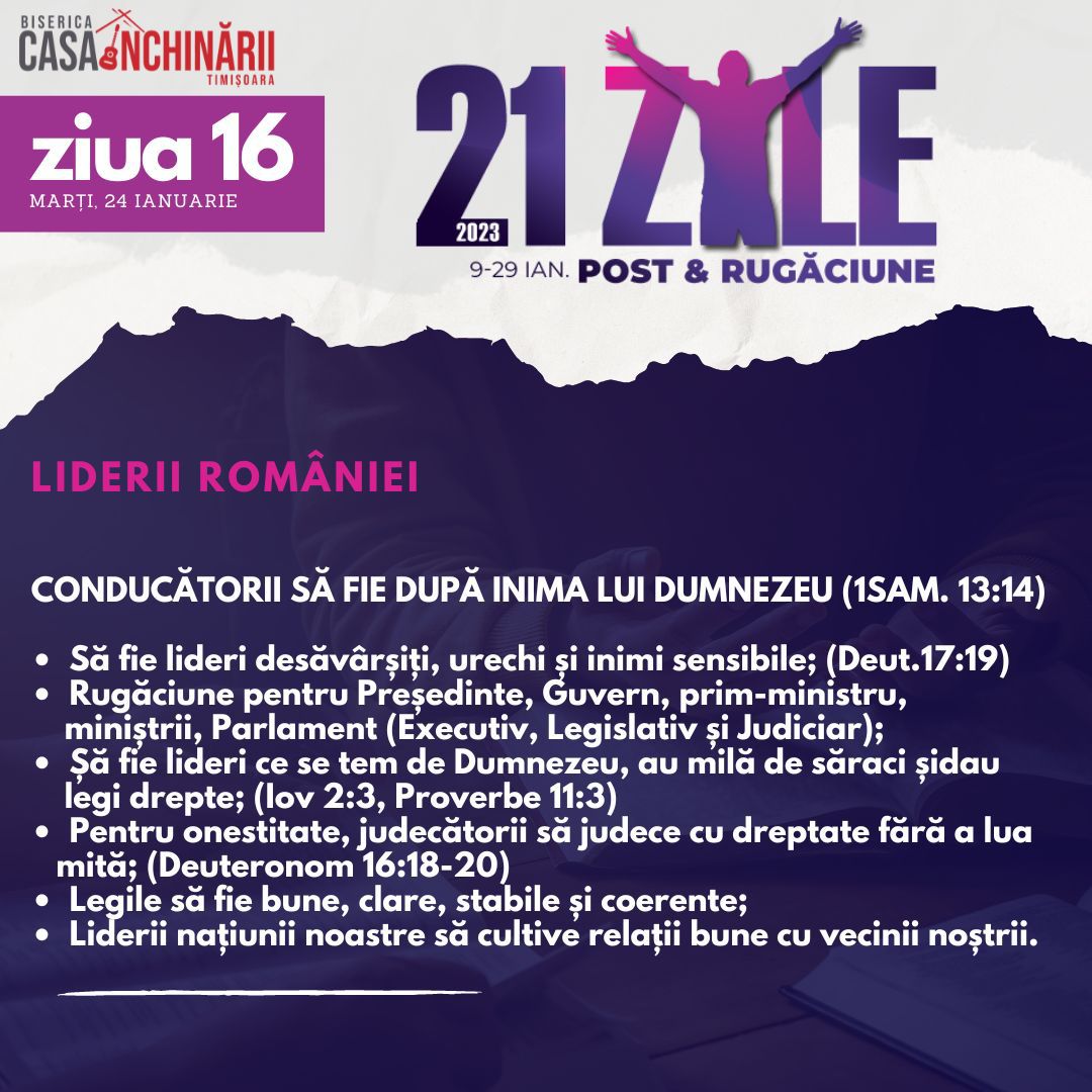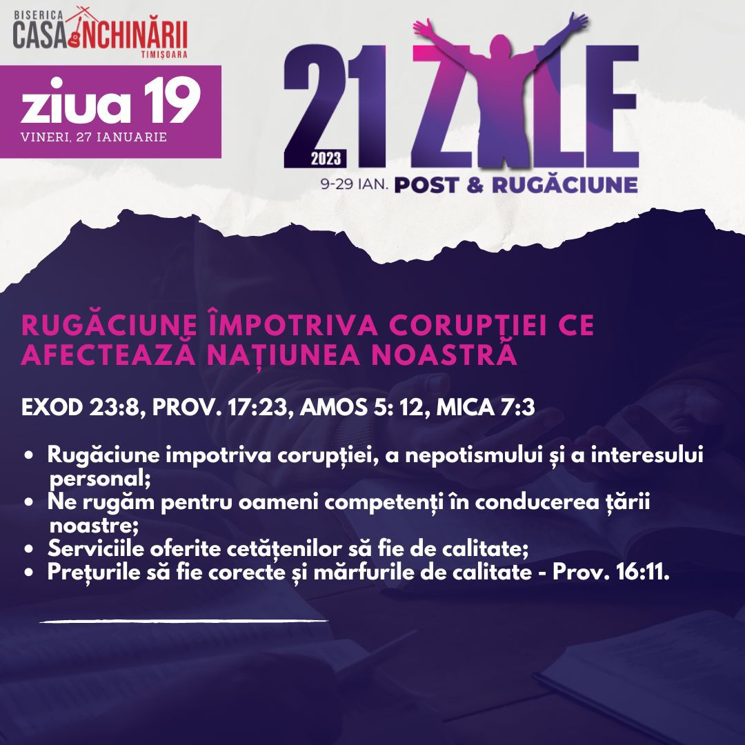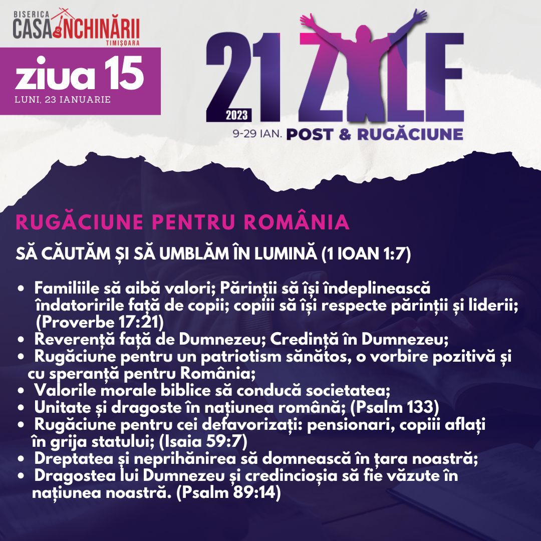 Să ne unim cu toții într-o perioadă de 21 zile de Post și Rugăciune, între 9-29 Ianuarie, apropiindu-ne de Domnul mai mult, pentru a putea împlini scopurile pe care El le are pentru noi în noul an 2023. Vom avea teme de rugăciune zilnice, postate online mai jos și disponibile și în format tipărit.